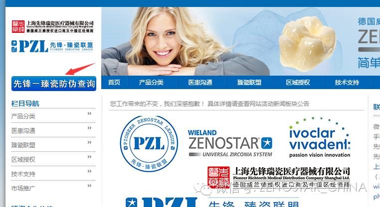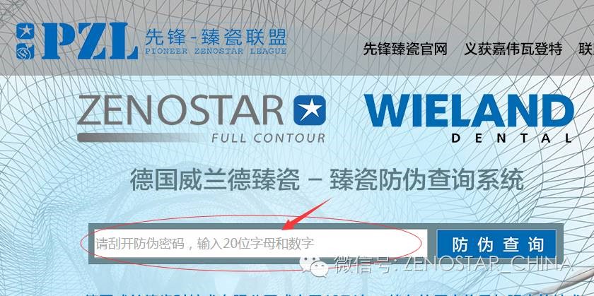 第二:打開威蘭德中文網(wǎng)http://www.zenostar.com.cn/,點(diǎn)擊左上方先鋒-臻瓷防偽查詢?nèi)缦聢D所示: